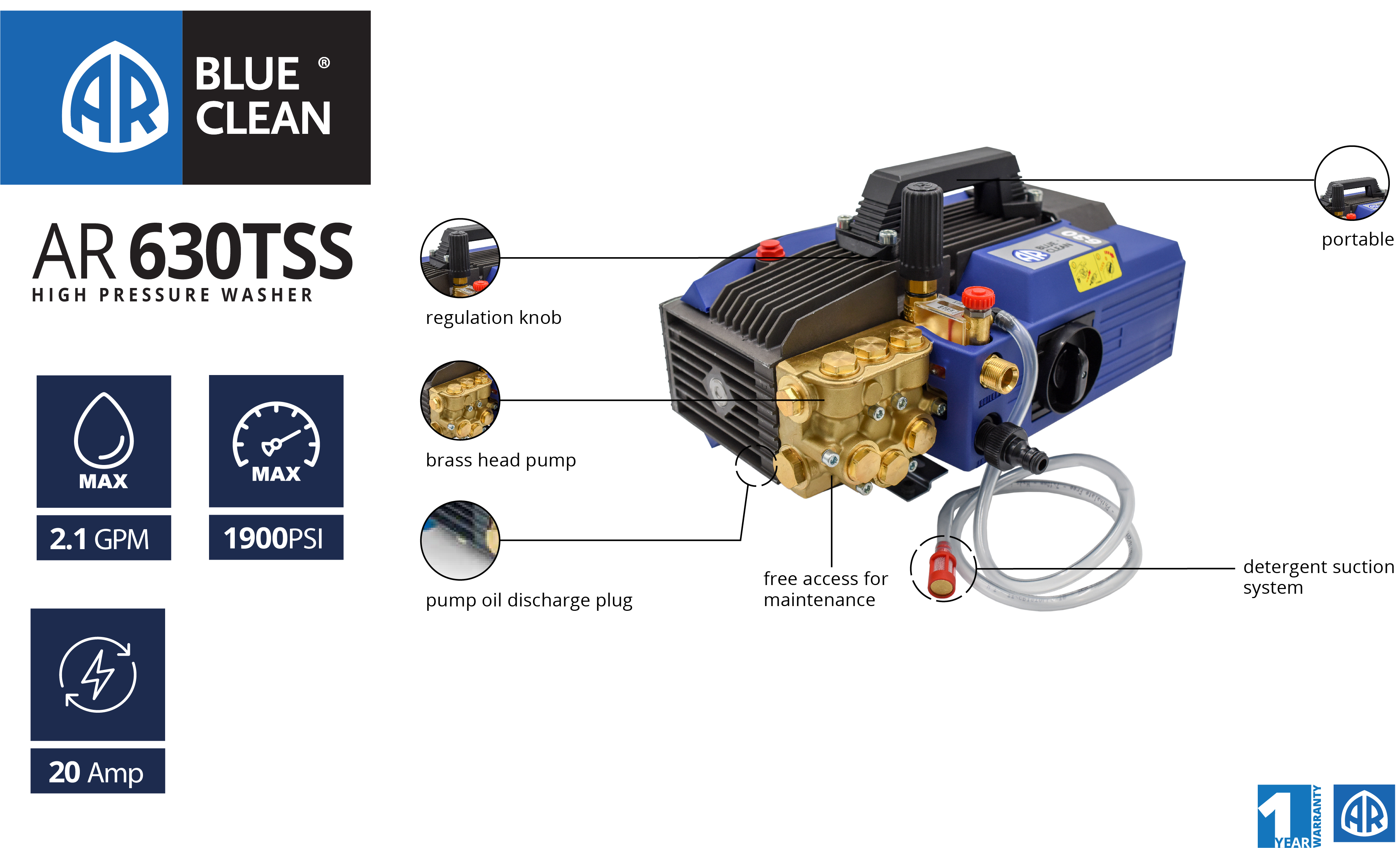 • AR Blue Clean Pro, AR630TSS, 1900 PSI, 20 amp, 2.1 gpm, Total Stop, Cold Water use, Electric Pressure washer
