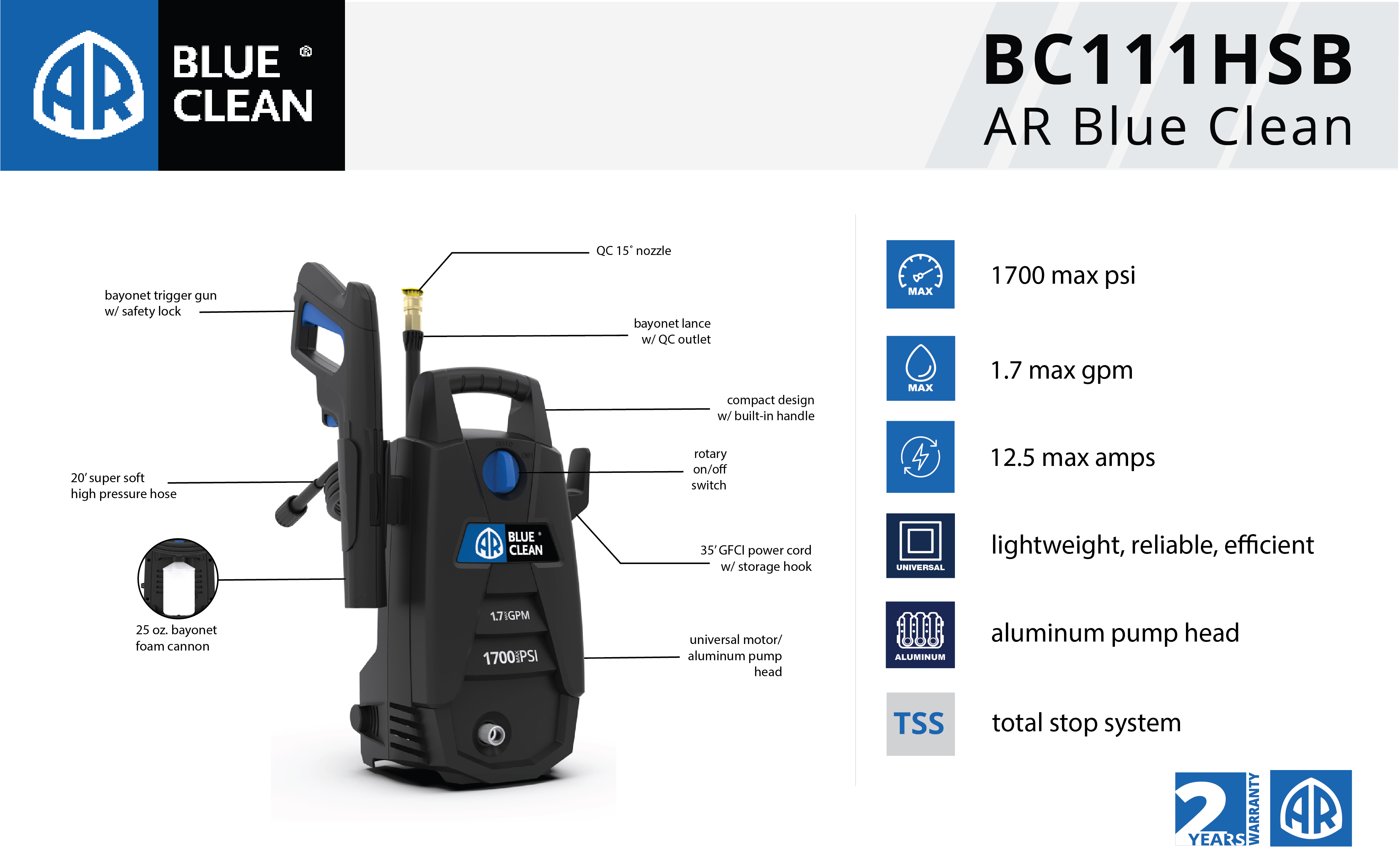 Introducing the AR Blue Clean BC111HSB Electric Pressure Washer, now redesigned in a sleek black finish while delivering the same powerful performance you expect. Engineered for all your outdoor cleaning projects, this tri-axial wobble plate pump offers up to 1700 Max PSI, 1.7 Max GPM, and operates with a 12.5-amp universal motor. The BC111HSB delivers maximum portability, featuring a built in carrying handle and only weighing 15 lbs, this unit is the perfect pressure washer to anywhere with little to no hassle. The BC111HSB is equipped with best in class accessories, this model includes a 100 series trigger gun, a 15-inch bayonet metal extension lance with a quick connect outlet, a 20-foot high-pressure soft hose, a 25-ounce bayonet connect foam cannon, and a 15-degree quick connect nozzle. Storing all these accessories is a breeze with the BC111HSB having ample on-board storage built onto the unit. Designed for durability, the BC111HSB is backed by a two-year limited warranty and features a Total Stop System (TSS) that automatically shuts off the pump when not in use, helping to extend the life of the unit. Trust the power and performance of the AR Blue Clean BC111HSB and start cleaning with confidence.
