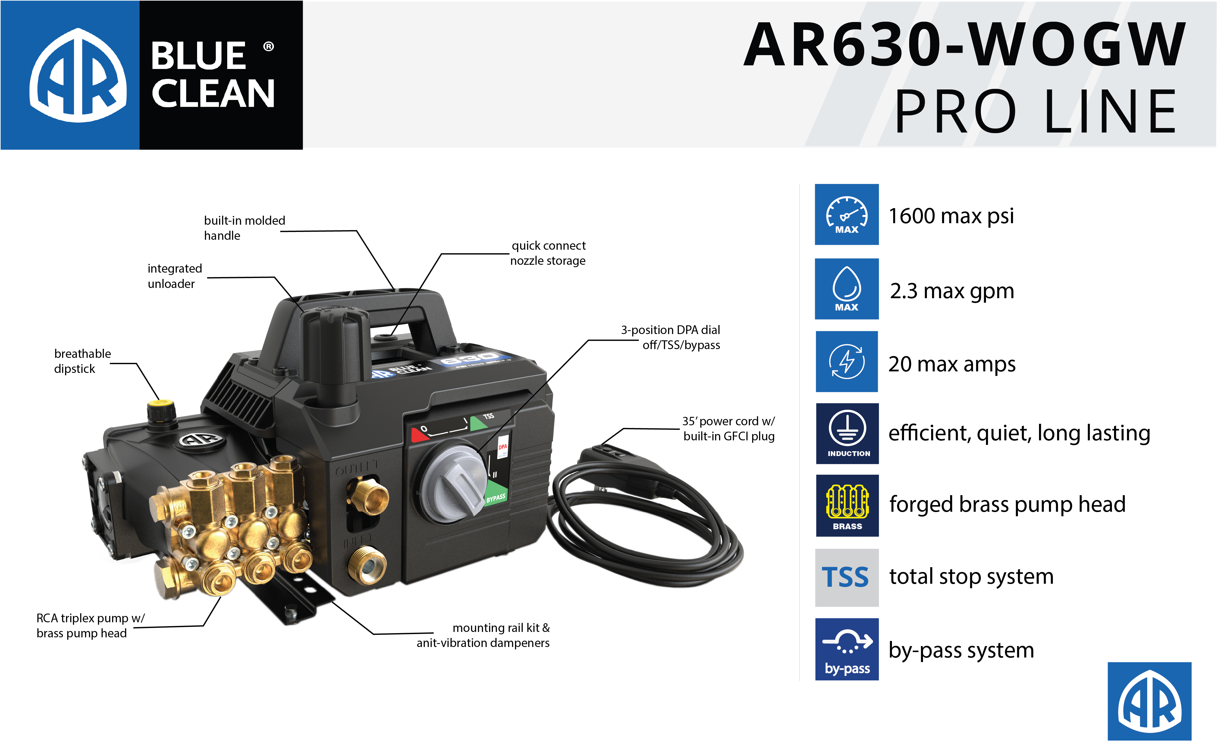 The new and improved AR Blue Clean AR630 showcases the first-of-its-kind Dual Pro switch and boasts a fully redesigned, sleek all-black frame. If you're looking for compact performance, look no further. The AR630 delivers 1600 PSI at 2.3 GPM. This professional-grade unit is powered by a quiet, long-lasting 20-amp, 110V, 60Hz single-phase induction motor and is matched with an Annovi Reverberi RCA brass pump with aluminum connecting rods for dependable, all-day performance.