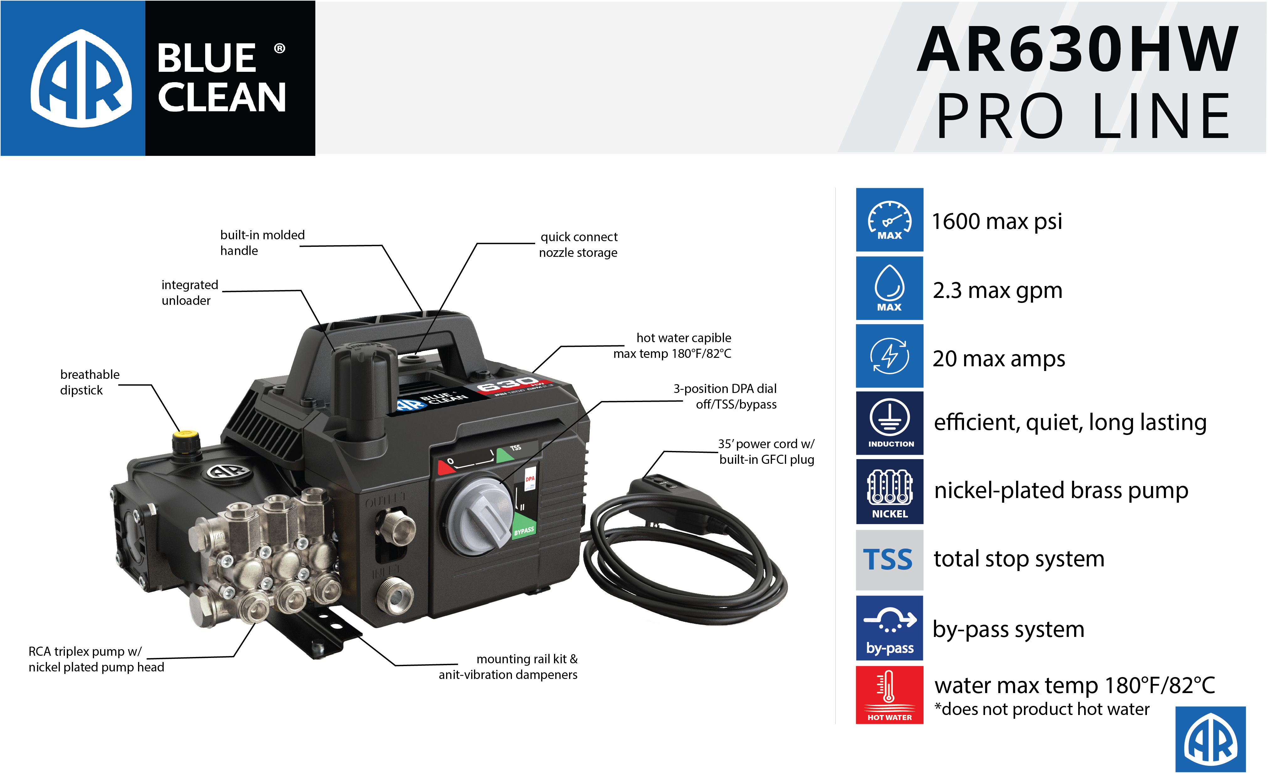 • AR Blue Clean Pro, AR630HW, 1600 PSI, 2.3 GPM, 20 Amp Hot Water Electric Pressure Washer with Accessories